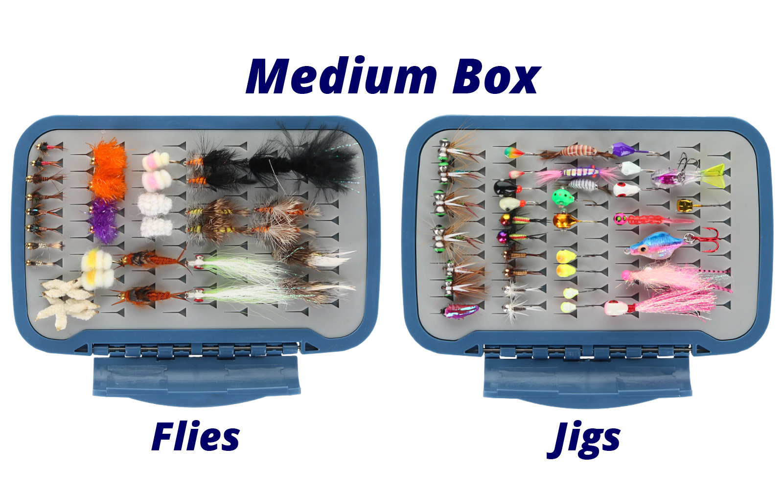 The FishUSA Flagship Dual Sided Fly & Jig Box gives trout, steelhead, and panfish anglers a compact and durable way to carry a full spread of patterns. With silicone anchoring pads that funnel and hold hooks without tearing, this hard plastic case doubles storage by offering slots on both sides. The small box holds up to 152 flies or jigs, while the medium holds up to 210. Heavy-duty latches and a clear lid keep everything secure and visible, making it a dependable choice for wading vests, packs, and travel bags.