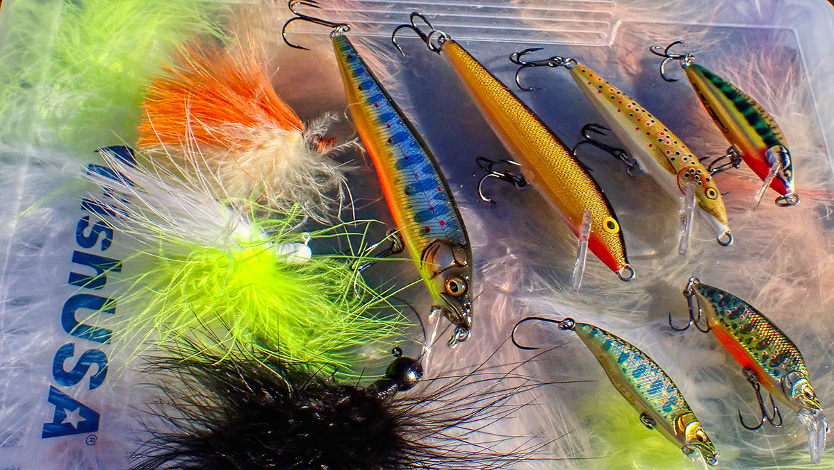 While there are lots of good options for trout, winter can often be a good time to fish with a bit bigger offerings. This is often a time when your trout jerkbaits and hard minnow baits like the Trout Magnet Crank, Megabass Great Hunting GH Humpback, Rapala Husky Jerk, and Countdown Minnows all excel, as well as bigger hair jigs like the D2 Jig. It can also be a time when mop flies get really good. And crossover jig flies like the Trout Magnet Mop Drop Kit will really shine in the winter on a spring creek.