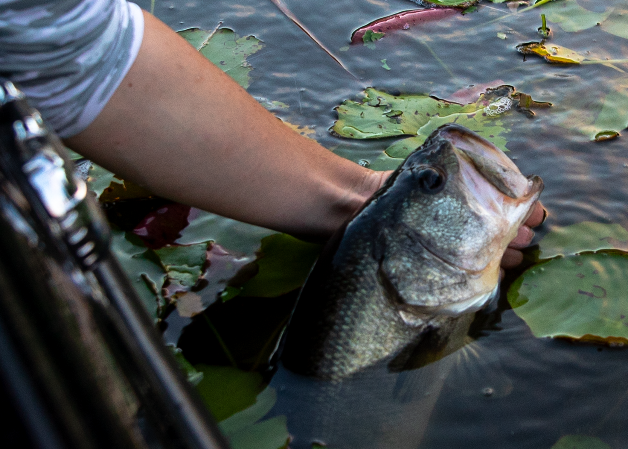 Look for saucer-shaped colonies near reeds and sand patches. A quiet approach matters—work a popping frog, prop bait, or small swim jig around the colony. If bass boil and miss, throw a weightless stickbait or fluke to mop up.