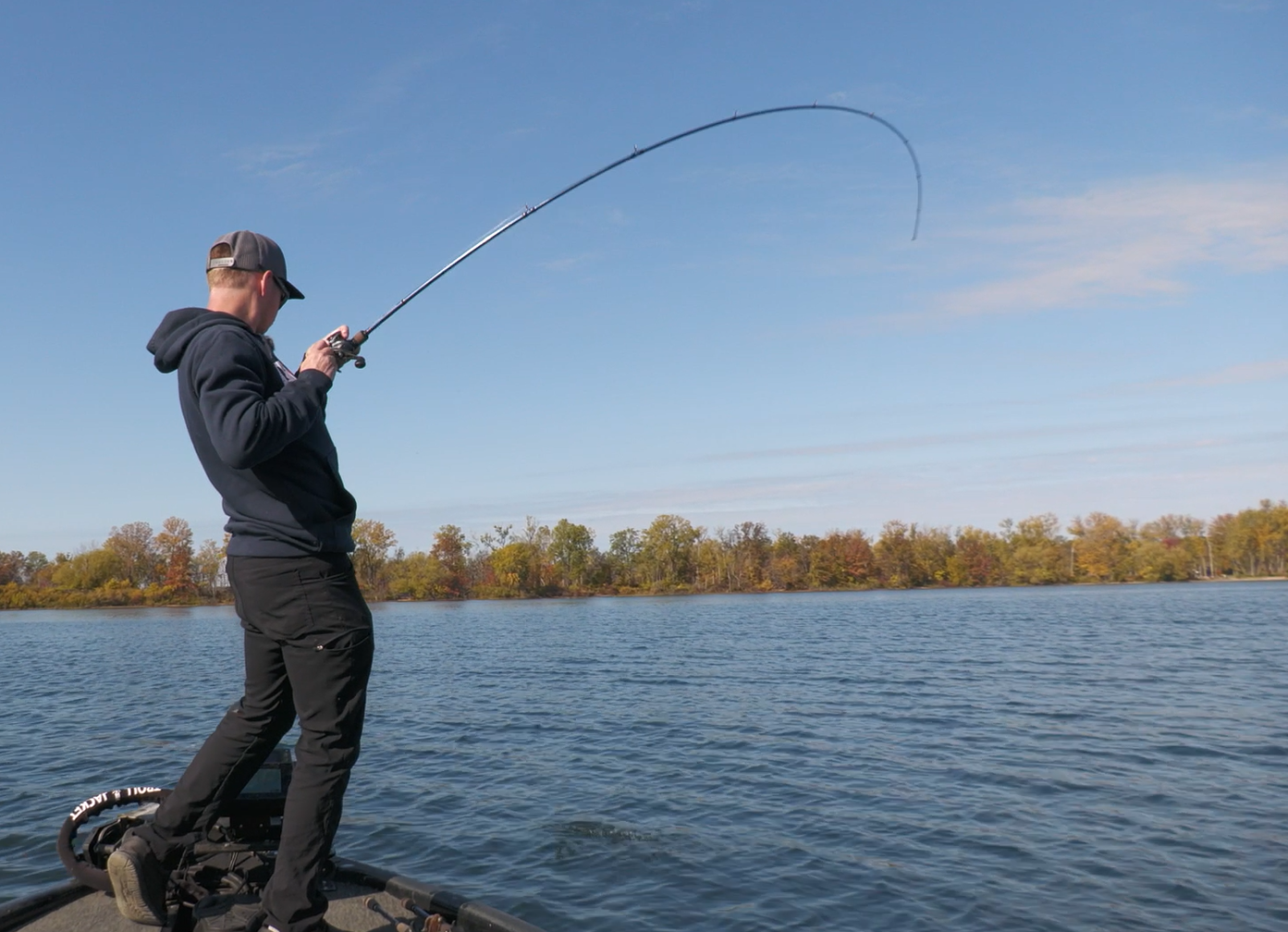 Depth and distance multiply slack. Your line cuts a long catenary (bow) in the water, plus fluorocarbon’s low but real stretch adds more give. A 7’1”–7’6” MH/H Fast casting rod increases line pickup per degree of sweep and gives you more lever arm to drive a thicker single hook home. With heavier jigs (3/8–1 oz) and C-rigs, think in terms of a long sweep set: reel until you feel solid pressure, then sweep through your ribcage while stepping back or rotating your hips. The longer blank keeps loading as you move, so you maintain pressure through stretch, bow, and the fish turning. Fluorocarbon shines here; its density keeps belly out of the line, and its lower stretch than mono helps translate your sweep into penetration—especially at 20–30+ feet.